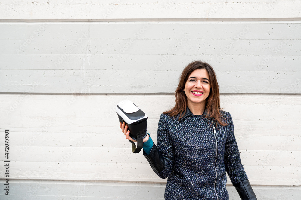 Portrait with smiling caucasian woman showing a virtual reality headset. Urban wall with copy space. Future of technology concept.