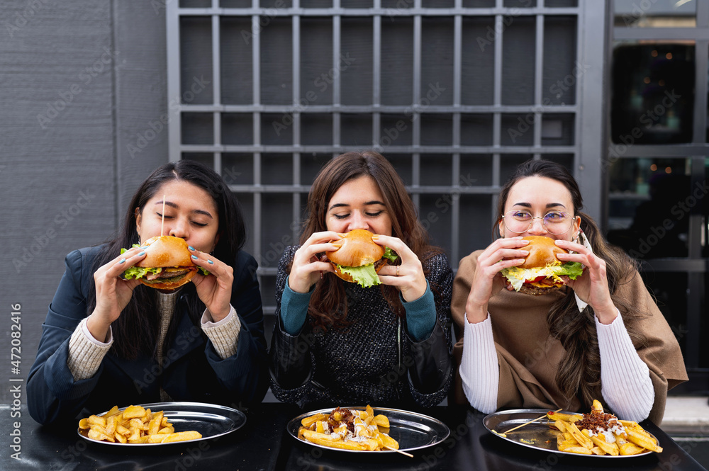 Females sitting at table restaurant biting burgers. Fast food unhealthy eating.