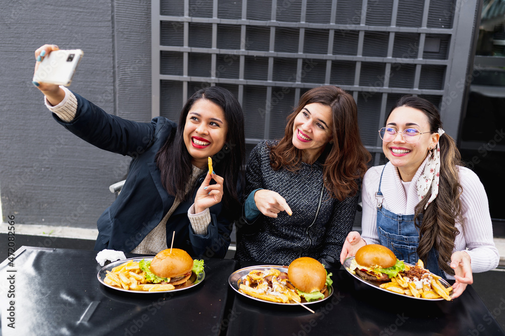 Young Female friends taking a selfie portrait with smartphone sitting at table restaurant pointing hamburgers. Happiness and togetherness.