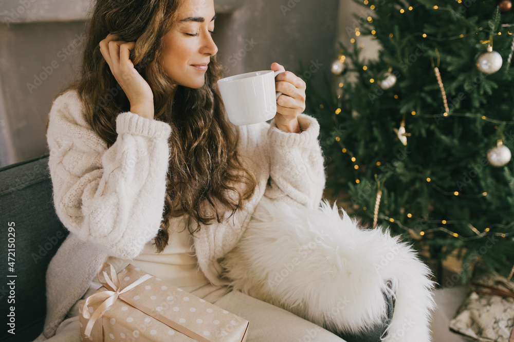 Young woman drinking hot coffee or cocoa sitting on couch in cozy room with Christmas tree. Winter holidays.