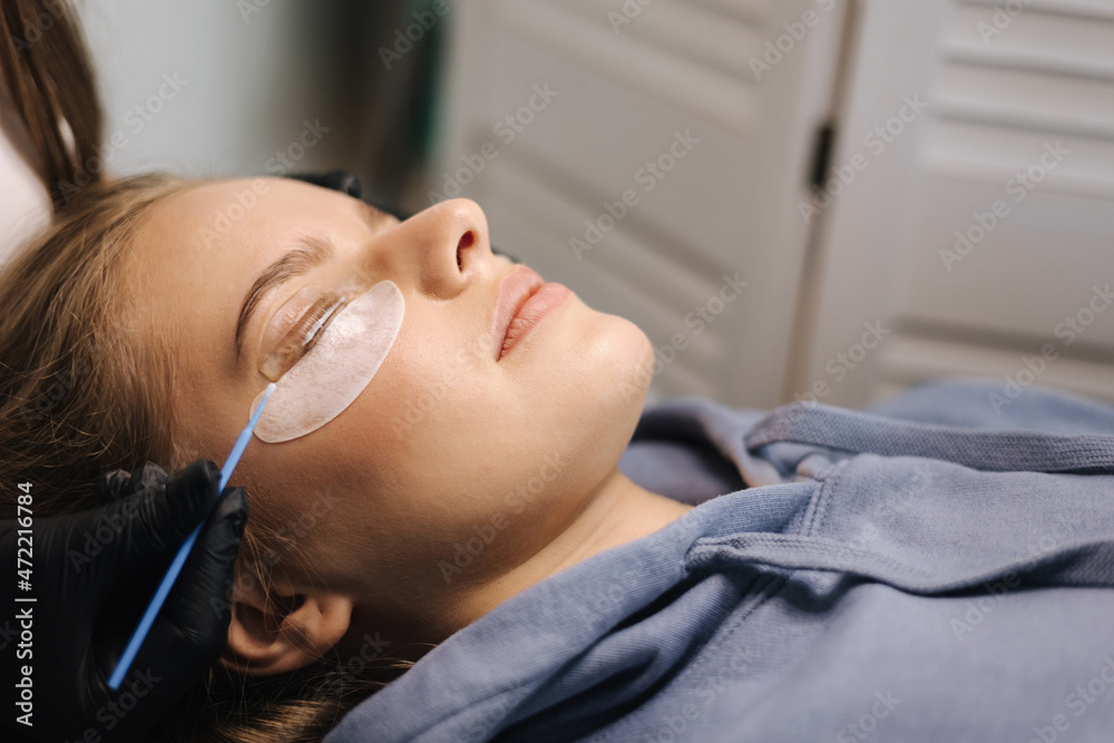 Attractive blond hair model in beauty studio having eyelash lamination. Modern useful procedure for lashes