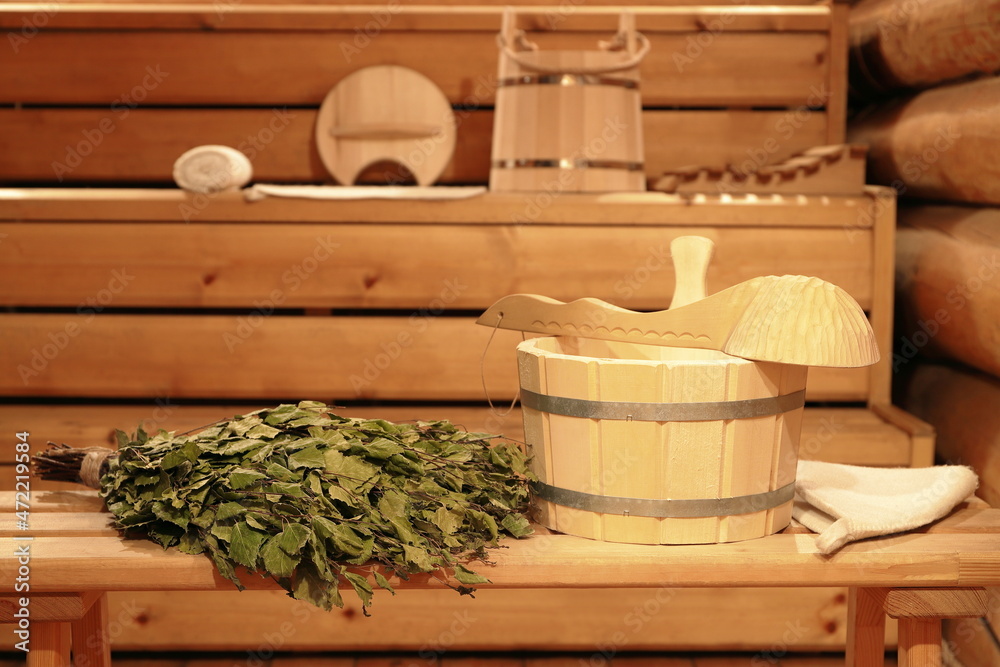 Birch broom on a wooden bench and traditional sauna accessories in the interior of the Russian bath.