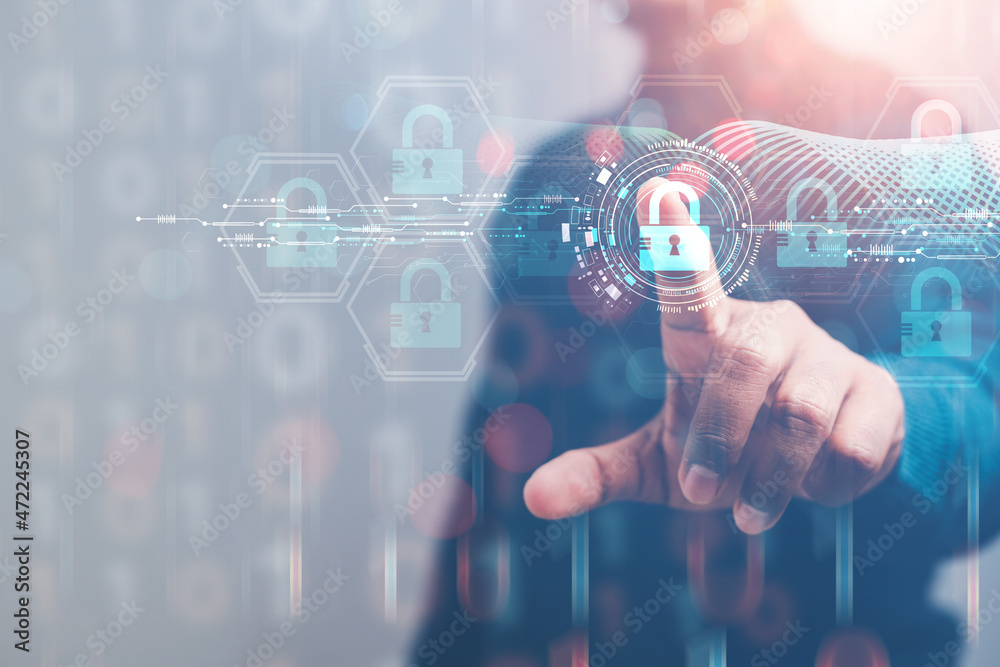 cybersecurity concept Business man shows how to protect cyber technology network from attack by hackers on the internet. Secure access to privacy through smartphones Meta protection.