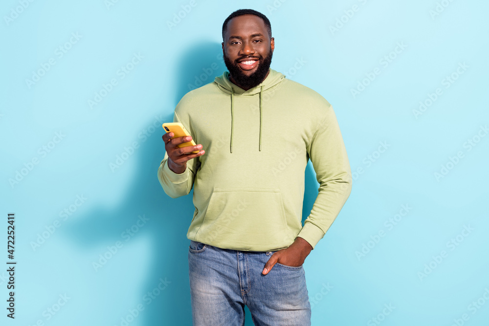 Portrait of satisfied friendly man hold telephone hand in pocket toothy smile isolated on blue color background