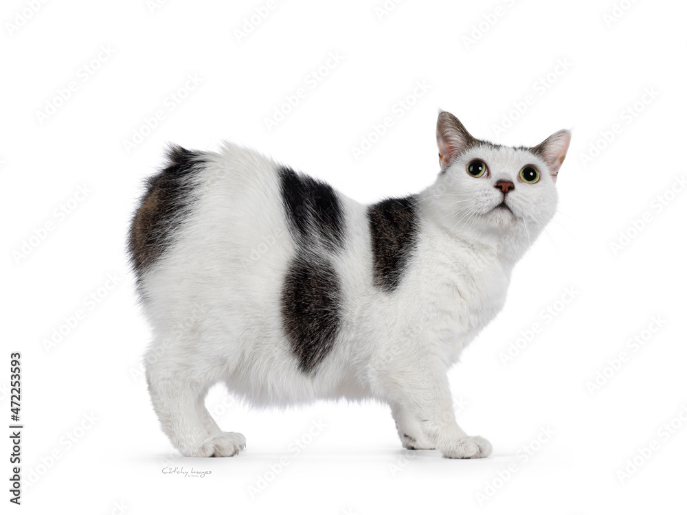 Manx cat standing side ways. Looking up. Isolated on a white background.