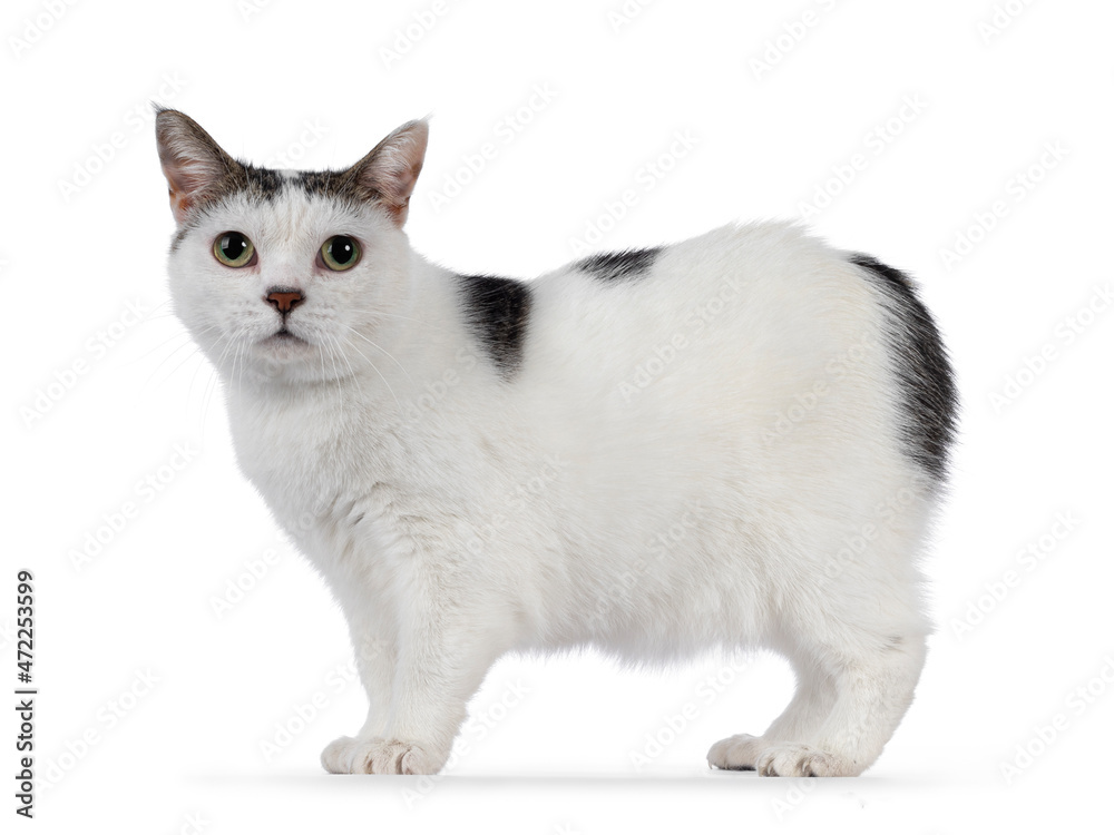 Manx cat sitting up side ways. Looking away from camera. Isolated on a white background.