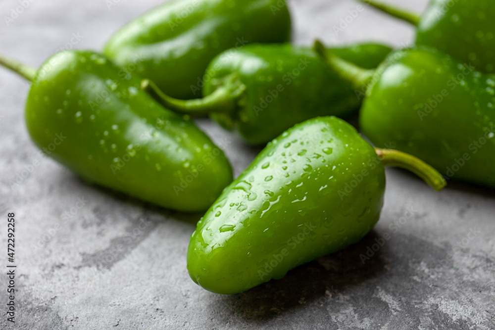 Ripe jalapeno or pepperoni on kitchen table. Closeup view of green chili pepper. Hot spice