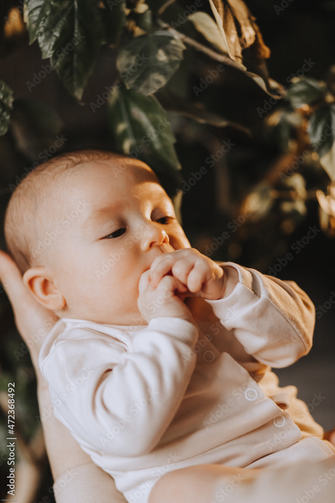 Candid shot of three month old infant baby during day nap time. Dry and healthy body and skin for children concept. Baby nursery