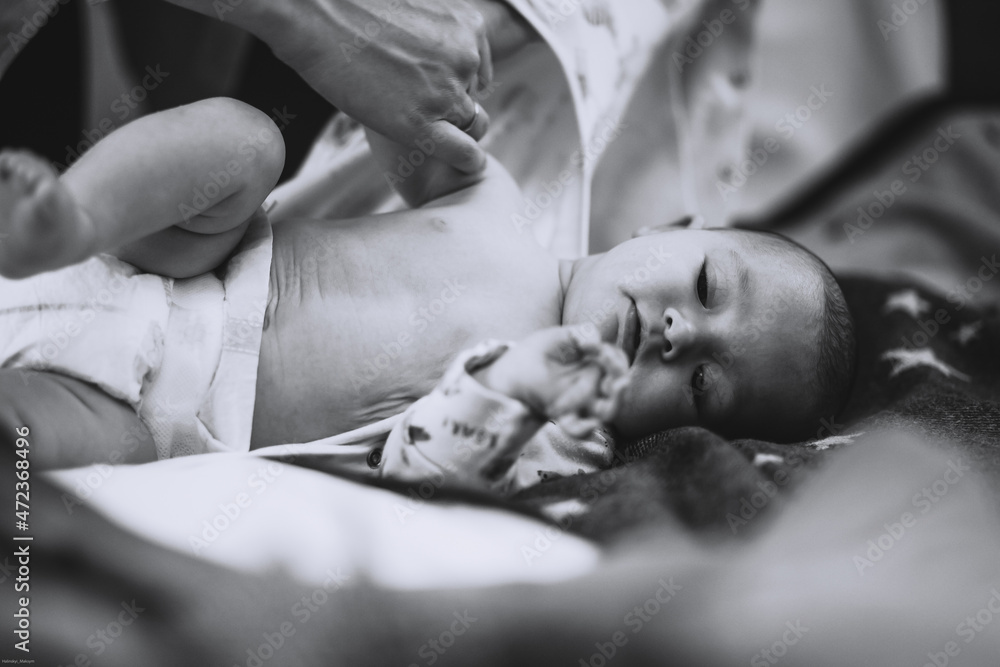 Candid shot of three month old infant baby during day nap time. Dry and healthy body and skin for children concept. Baby nursery