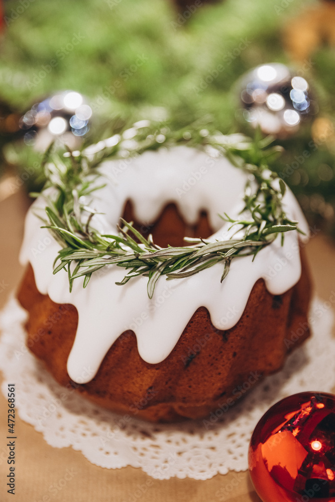 traditional homemade christmas cake with glaze decorated with fresh rosemary. Winter baking at Xmas or New Year with decorations on evening background..