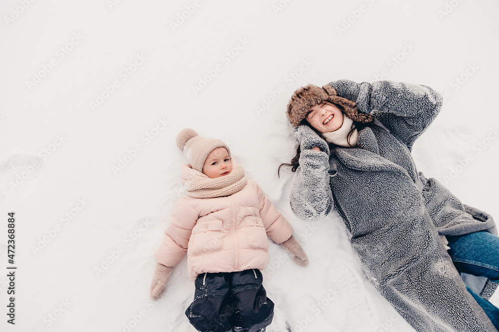 Mom and daughter in winter. Happy family enjoy winter snowy day. They hug, laugh, have fun, ride in the snow and enjoy the winter snowy weather