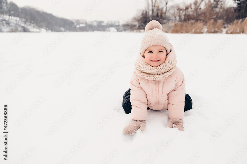 Happy laughing girl wearing a pink jacket, scarf and hat, playing in a beautiful snowy winter walk. Girl enjoys winter, frosty day. Playing with snow on winter holidays. Winter holidays concept.