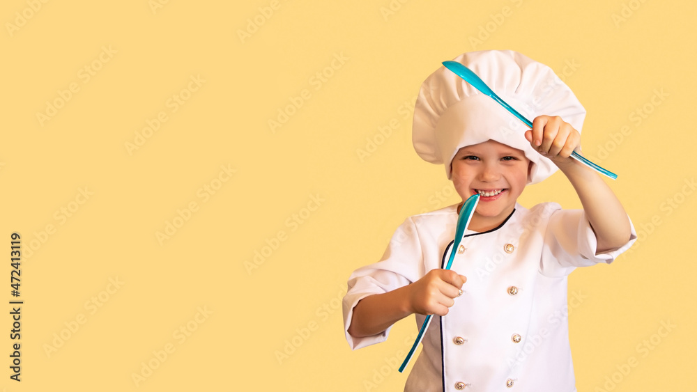 Funny child in white chef uniform,holding salad tongs in his hands like a ninja. Cheerful yellow background,large banner.