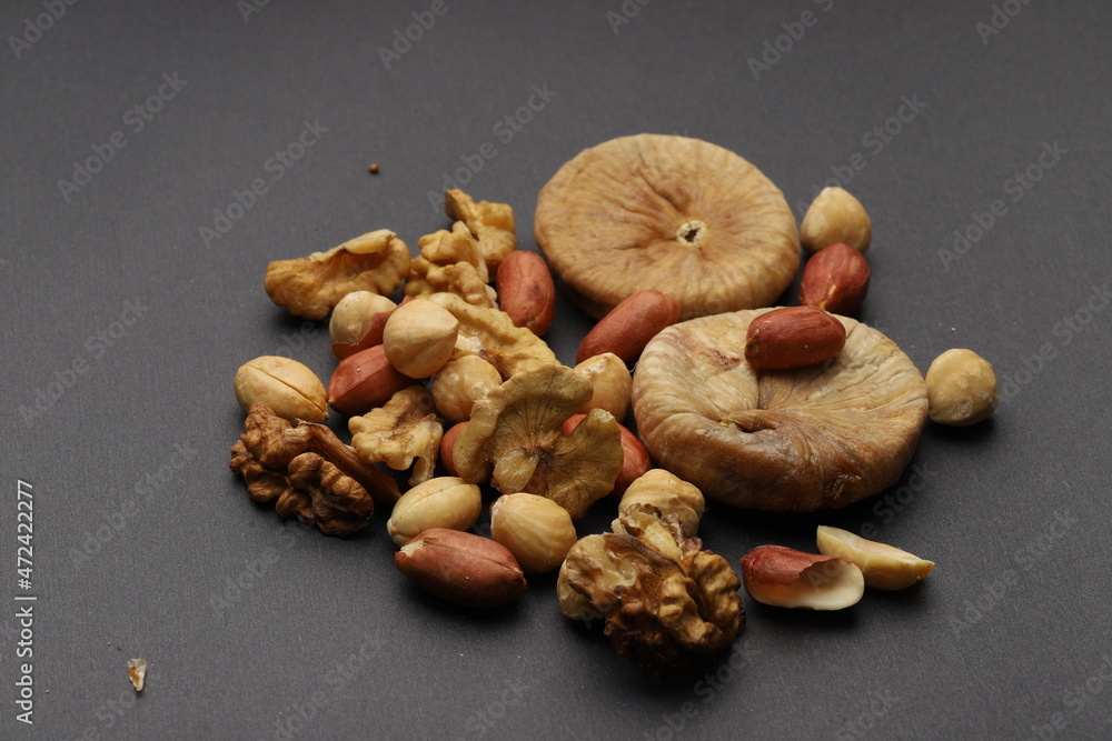 organic on black background ,hazelnuts,peanuts,walnuts,dried figs