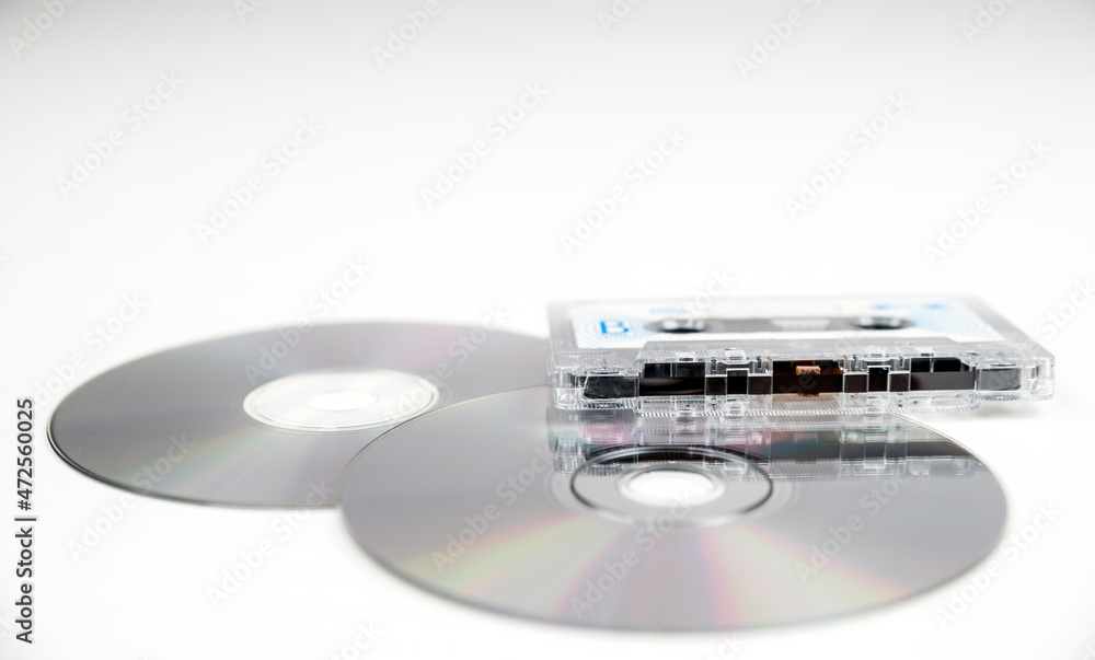 Cassette tape and compact discs on white background