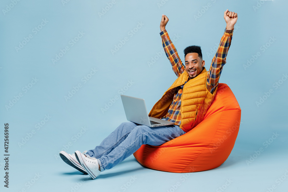 Full size body length young black man 20s wears yellow waistcoat shirt sit in bag chair hold laptop pc computer just found out great win isolated on plain pastel light blue background studio portrait.