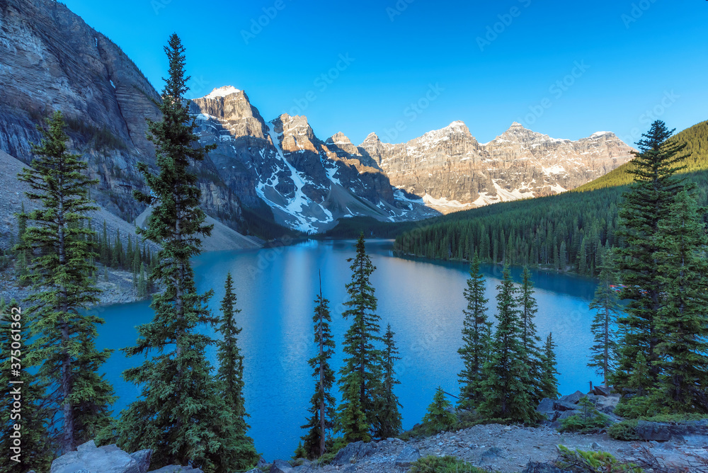 Beautiful turquoise waters of the Moraine Lake with snow-covered peaks above it in Rocky Mountains, Banff National Park, Canada.