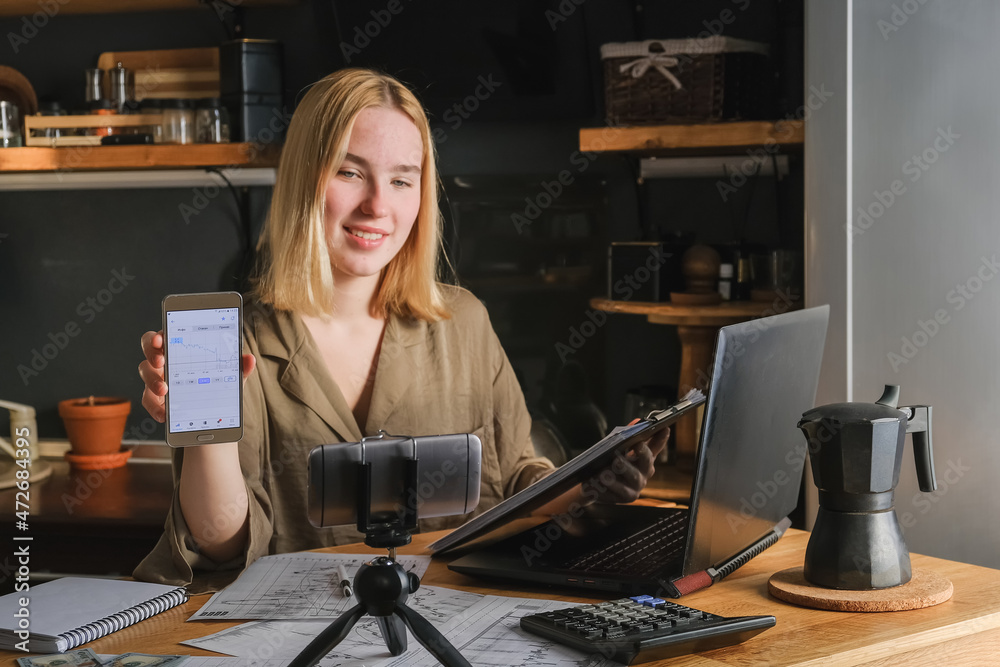 Investments. Young woman investor buys stocks on the stock exchange stock market from home. Generation z invests budget analyzes income of digital money. Cryptocurrency trading. Investor freelancing
