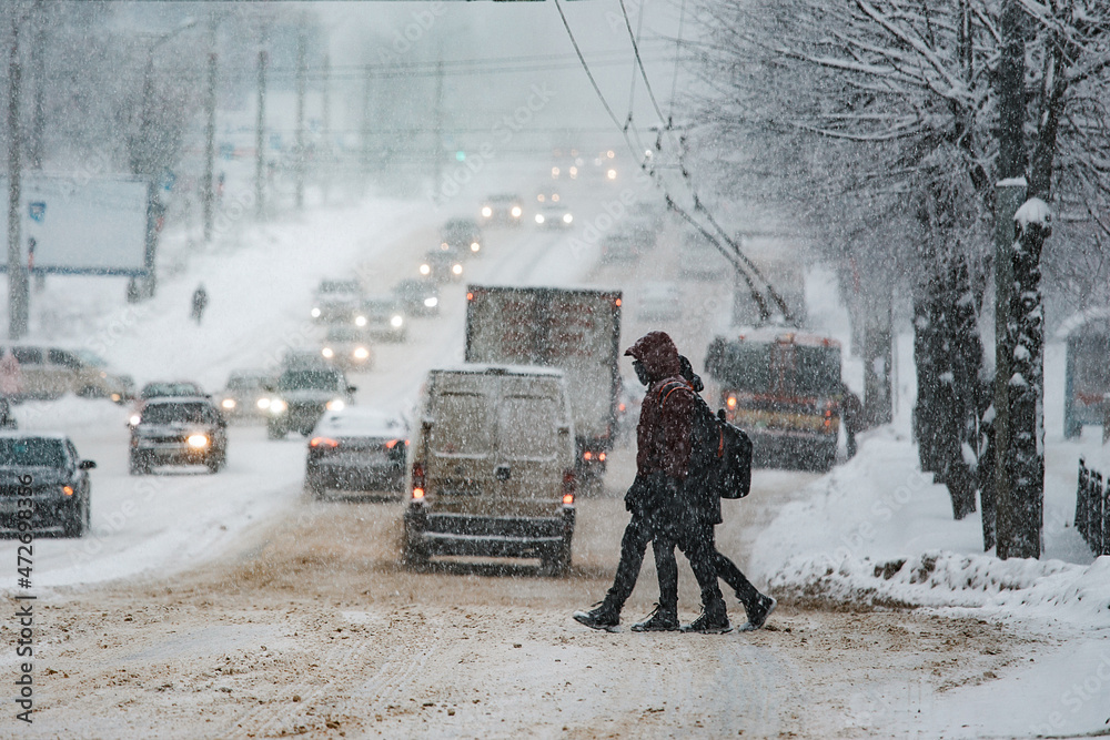 the city was covered by a snow storm, cold, climate change, movement is paralyzed because of the snow people move to the snowstorm on foot, hiding umbrellas and hoods, abnormal winter, precipitation