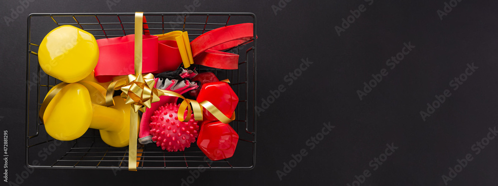 A festive set of tools for sports. Red and yellow dumbbells, fitness bands, gloves and a massage ball lie in a metal basket on a black background. Top view, flat lay, copy space, space for text
