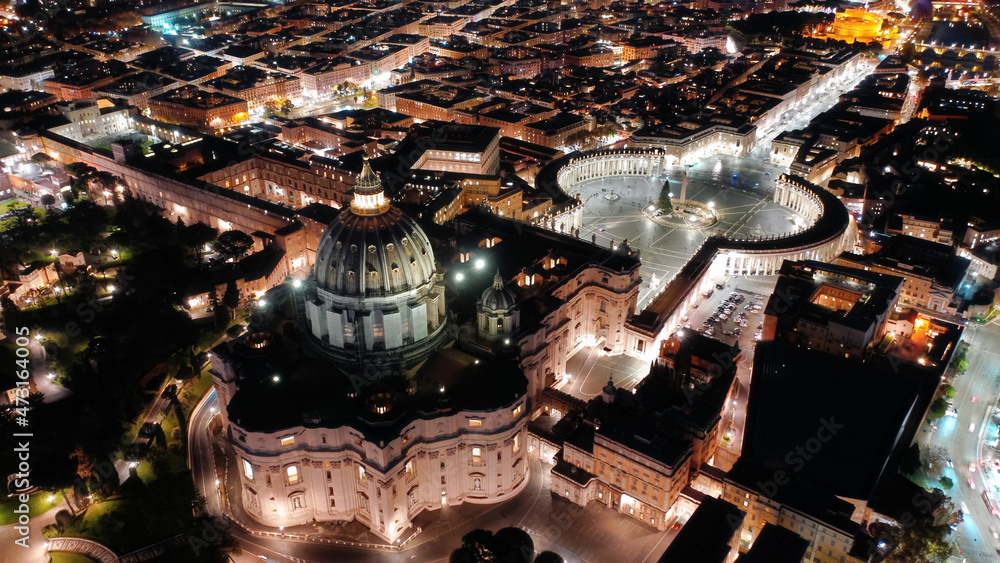 Aerial drone night shot of iconic masterpiece Saint Peter Basilica and whole illuminated city of Vatican the biggest church in the world, Metropolitan city of Rome, Italy