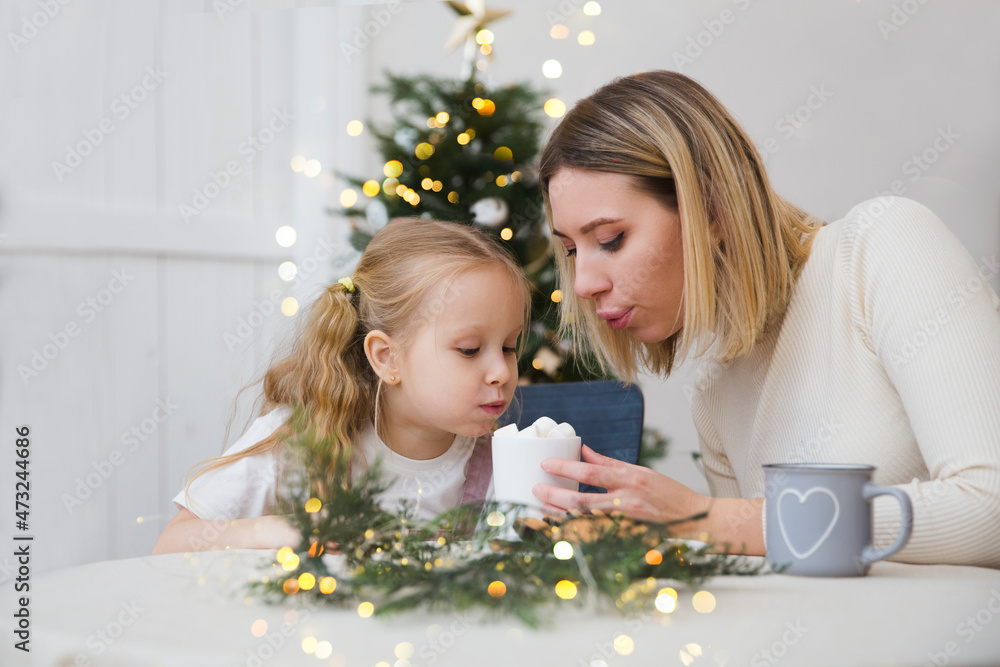 mother and child daughter drink hot cocoa with marshmellow on Christmas holidays at home. family meets Christmas together at home
