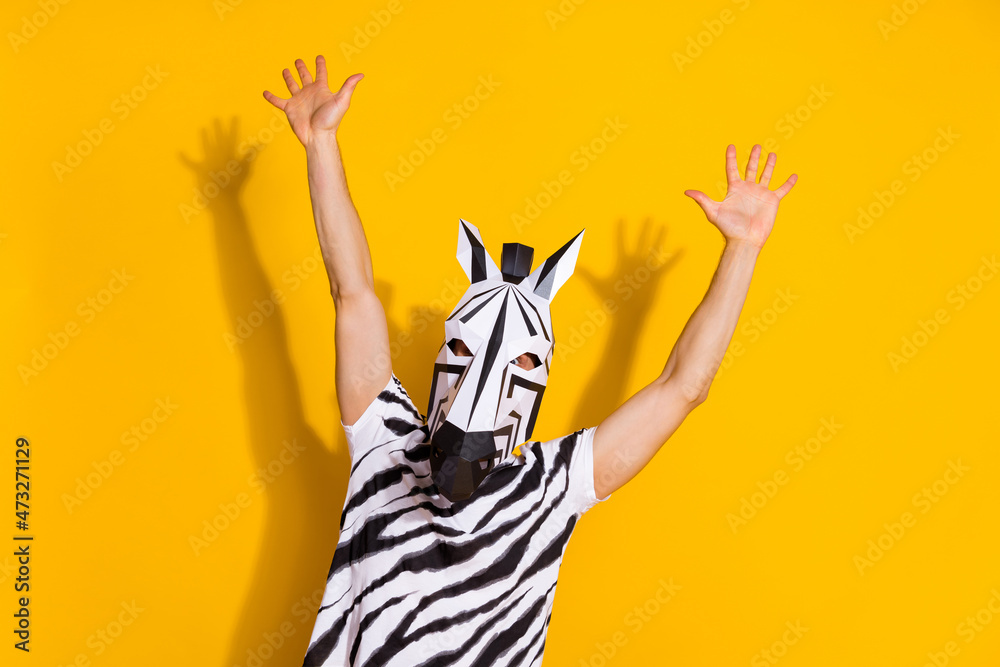 Photo of bizarre incognito guy in zebra mask arms up enjoy mardi-gras festival offer isolated over bright yellow color background