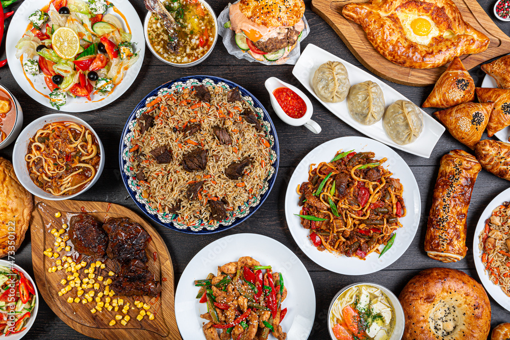 The concept of Eastern asian festive cuisine. Assorted Uzbek food set, pilaf, samsa, lagman, manti, shurpa restaurant concept Eastern arabic new year and Christmas dish from lamb served cookware.