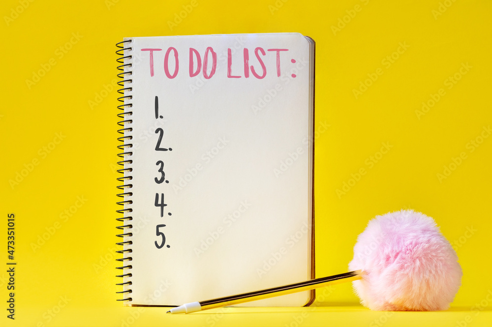 Open spiral notebook with to do list and golden pen with pink fluffy ball on bright yellow background
