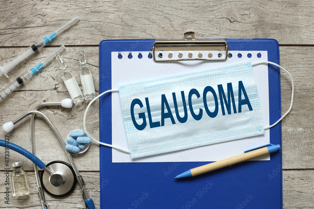 GLAUCOMA. the concept of medicine is a text on a white sheet of paper on a gray background. blue stethoscope syringes