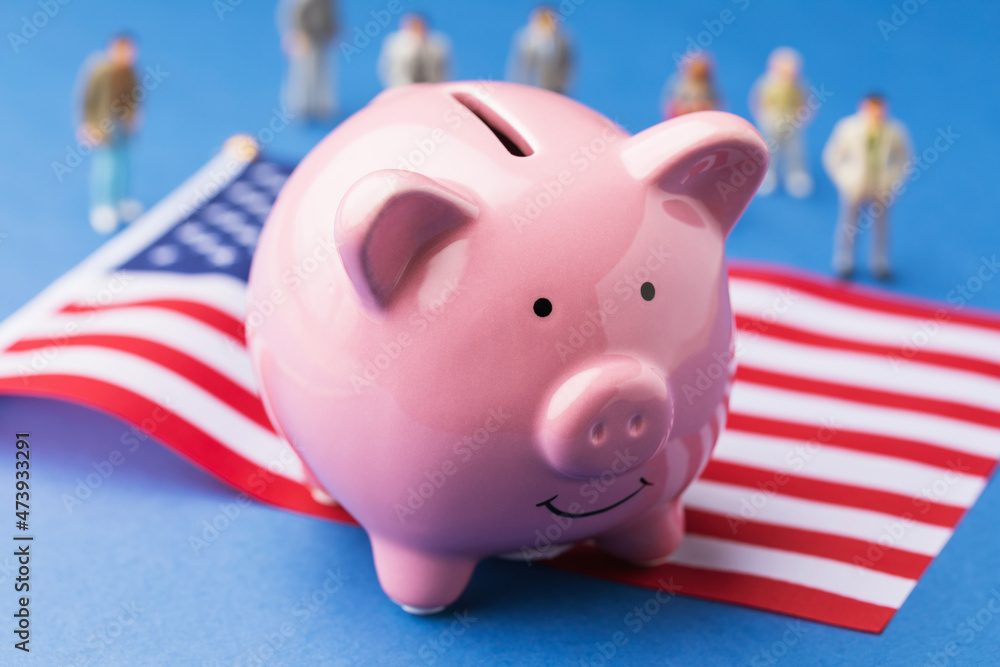 Ceramic piggy bank, American flag and plastic toy men on a blue background, a concept on the theme of the country's population income