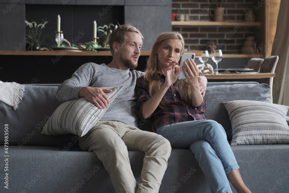 Enamored European couple communicating choosing travel tour tourism use online mobile application smartphone. Man and woman relaxing on comfortable couch together having time for yourself at home