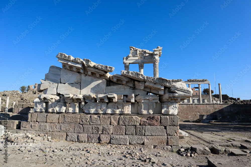 beautiful temple of Trajan with white marble columns on blue sky background, ancient city Pergamon, Turkey