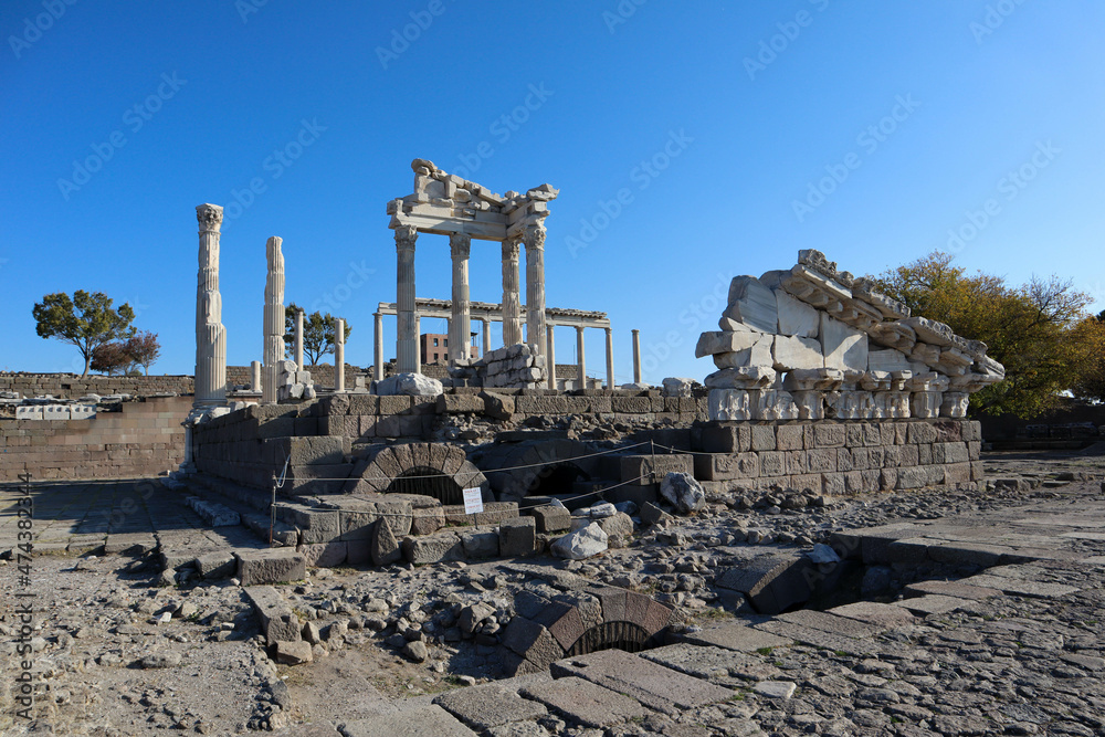 beautiful temple of Trajan with white marble columns on blue sky background, ancient city Pergamon, Turkey