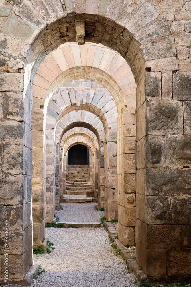 beautiful ancient old stone arch corridor in the ruins of Pergamon city in Turkey