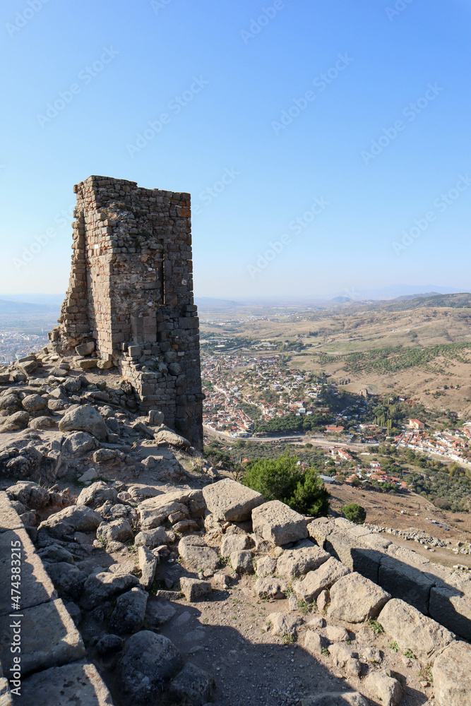 past and present - scenic view to the modern city Bergama in Turkey from ruins of ancient city Pergamon