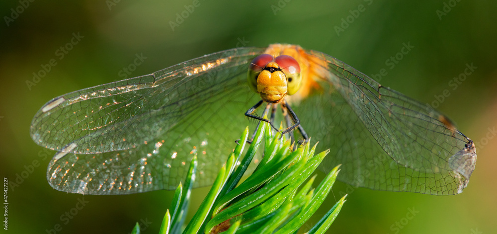 A dragonfly sits on a green branch of a Christmas tree.