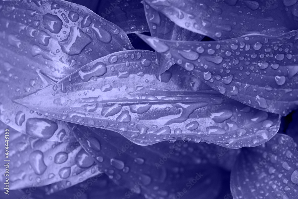 Top view photography of the glossy leafs with rain drops,colored in trendy 2022 color.