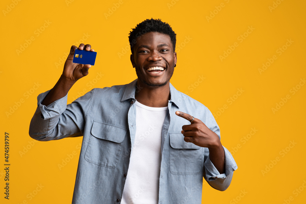 Happy black guy showing credit card on yellow