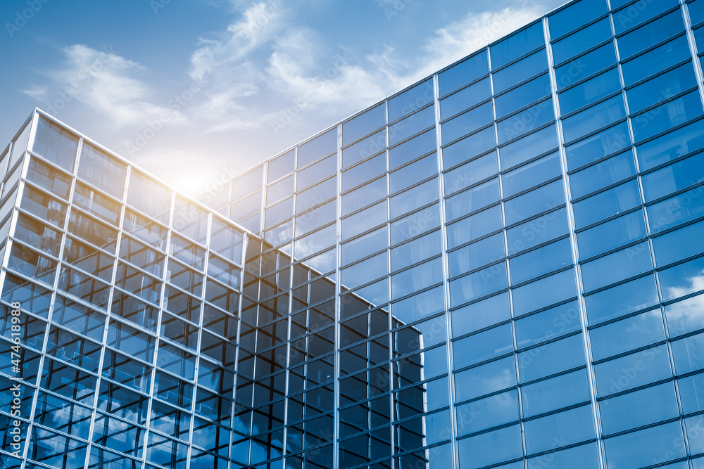 Modern office building with glass facade on a clear sky background. Transparent glass wall of office building.