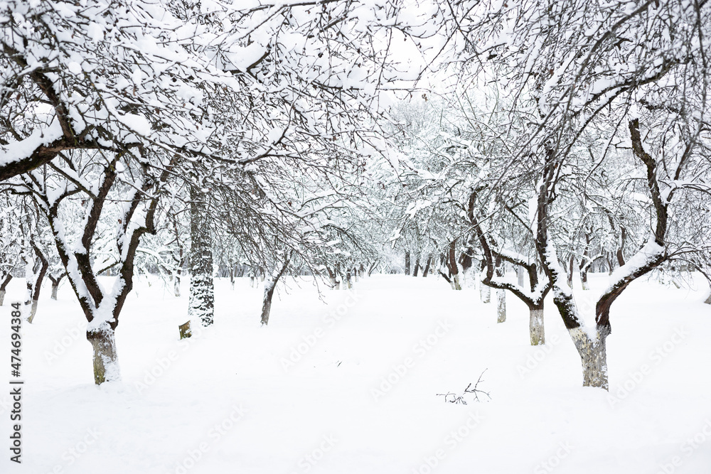 Snow-covered apple orchard on frosty winter day. Beautiful natural background