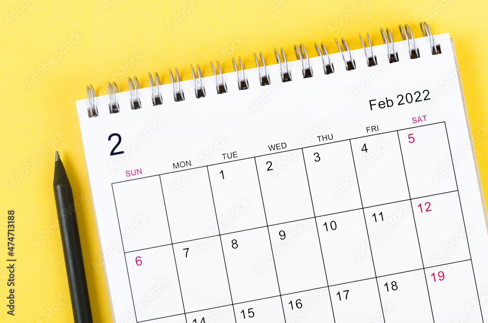 February 2022 desk calendar on yellow.