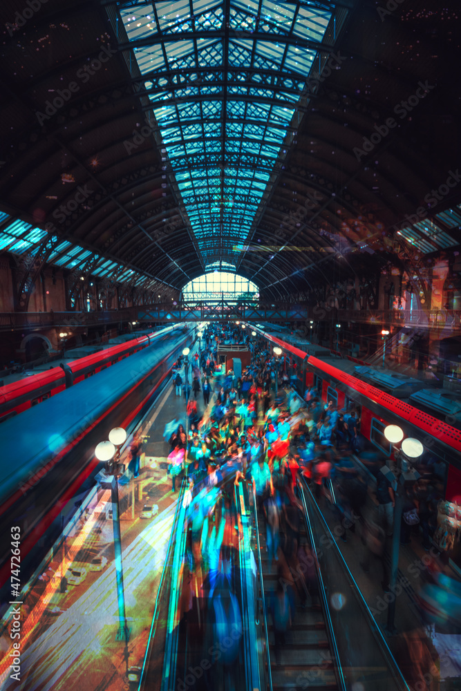 Abstract city night blurred light double exposure moving train and people background. Concept image.