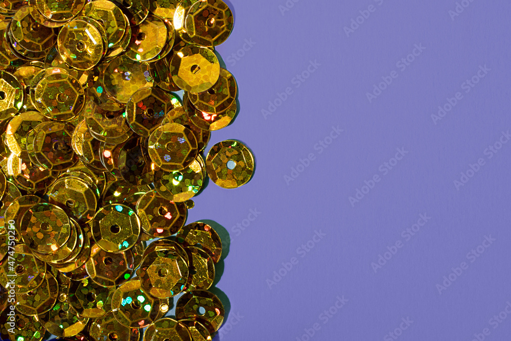 Shiny golden sequins on trendy violet color background.Festive banner with copy space.