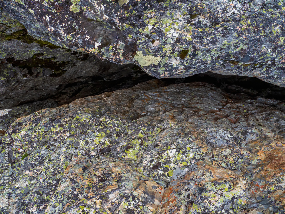 Crack in granite. Narrow entrance to the cave. Fault line or fracture in the rock, erosion, a crack in the stone.