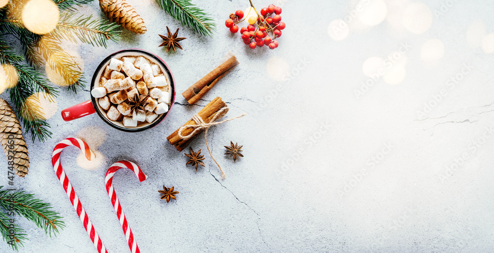 Christmas holiday creative layout with marshmallow hot chocolate, fir tree branches and pine cones