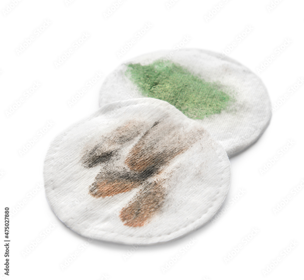 Dirty cotton pads after removing makeup on white background
