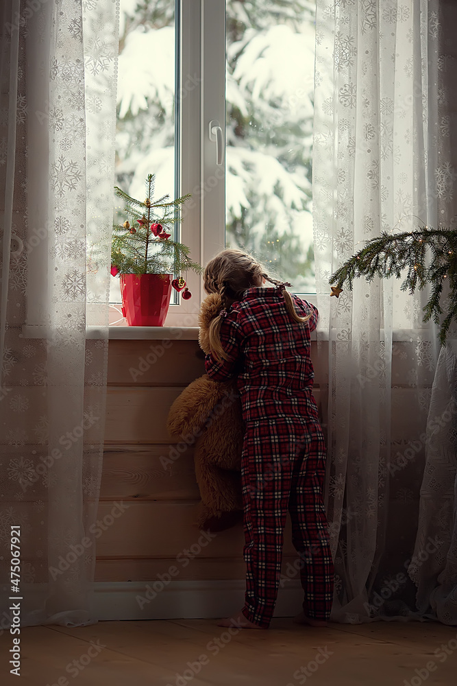 A cute little girl in New Year's pajamas with a teddy bear looks out the window. Merry Christmas and happy New Year.