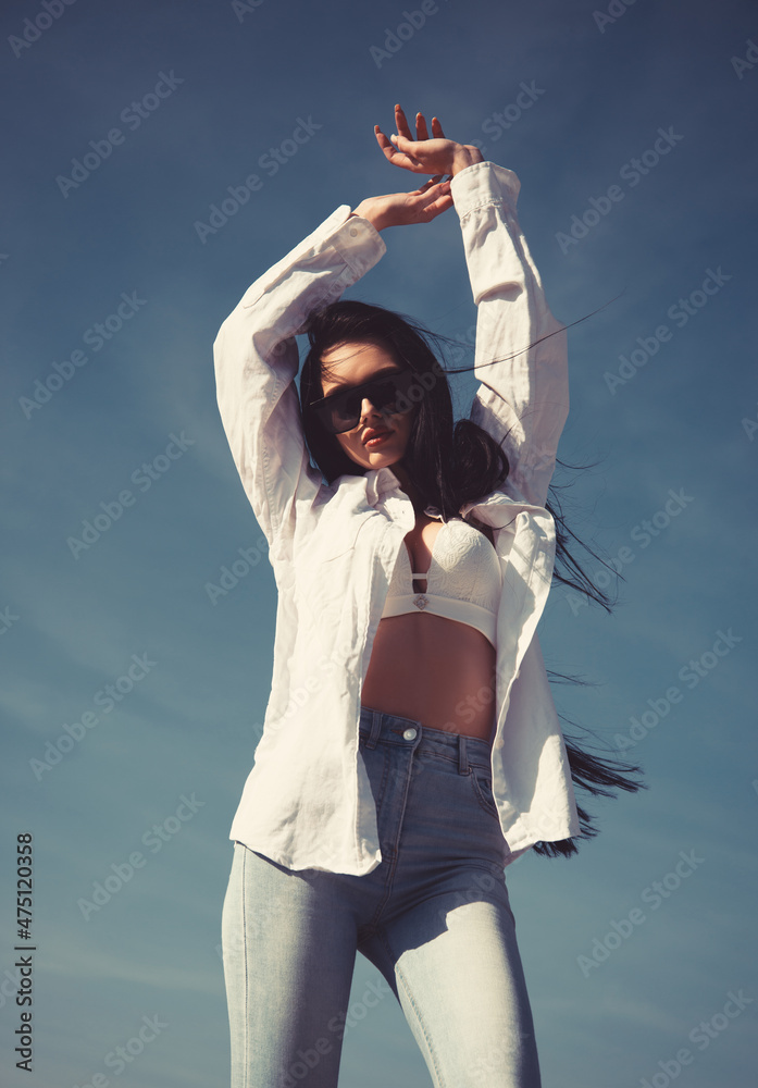 Young passion sexy girl in a white with long windy hair is standing and flirting on the roof background city in sunset.