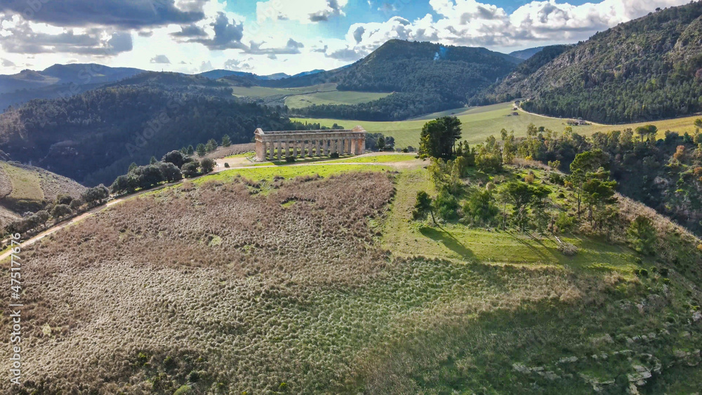 Temple of Segesta in the countryside of Sicily, Italy. Aerial view from drone
